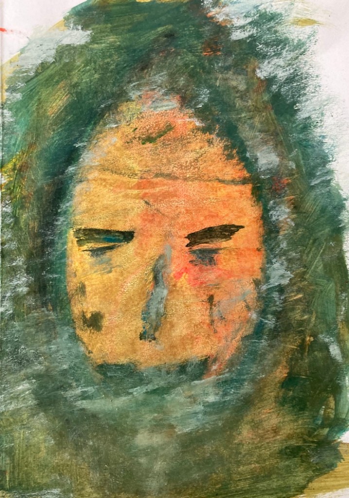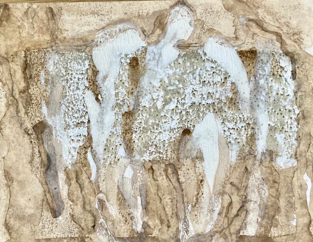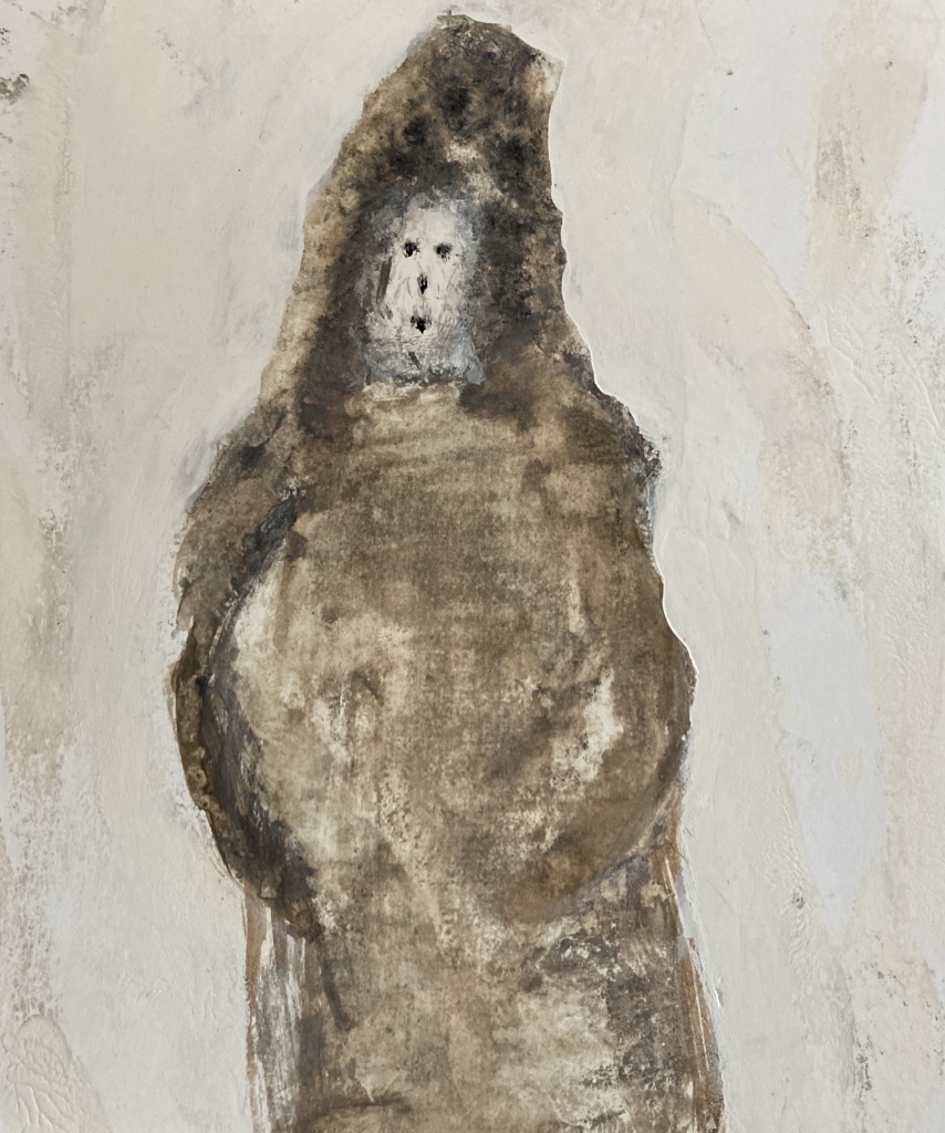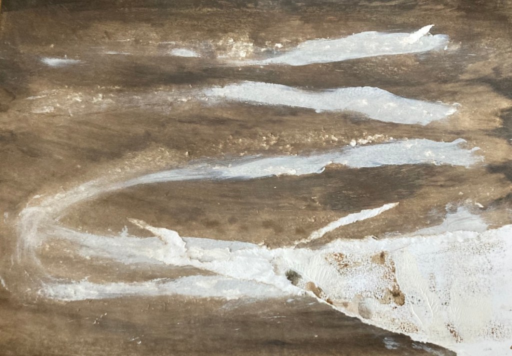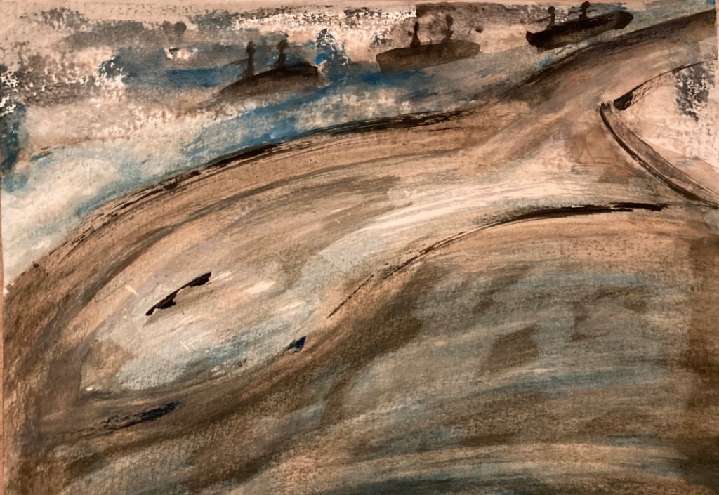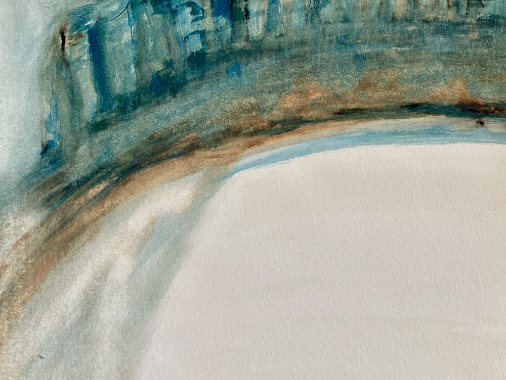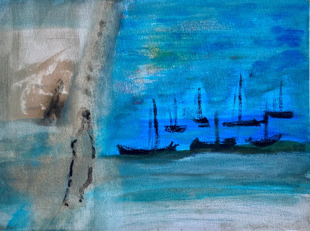 L’été 2024, à l’écoute d’un besoin de matières et de couleurs, je me saisis de gouaches et de papier…Sans rien anticiper… C’est alors que le personnage qui ouvre ce récit apparait. Je le reconnais immédiatement comme le narrateur de Baleines. Et le reste suit… Impossible de ne pas songer à Monsieur Paul Watson à l’heure où j’écris ces lignes. Que l’esprit des baleines veille sur lui. » Il y a un dieu caché dans le ciel, la rivière, la corolle des fleurs éphémères et même dans l’œil de la baleine « . (Terre Mère, Jean Malaurie)