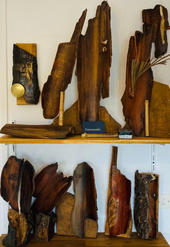 Dans le salon, il veille sur les autres pièces de bois qui naissent peu à peu, rappelant un vers ou un poème déjà écrit ou en faisant surgir un nouveau….